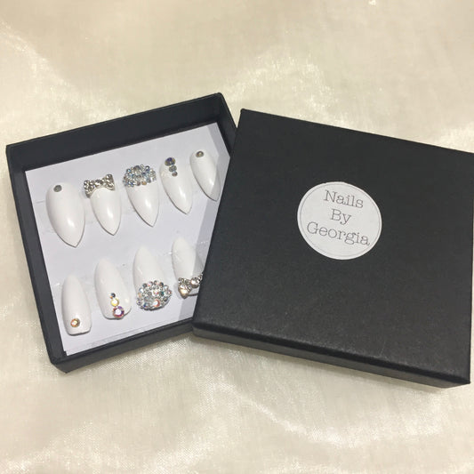 White Glossy Stilettos with Rhinestone and Silver Bead Design