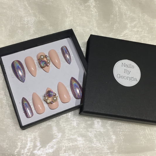 Pink and Pink Holographic Stilettos with Rhinestone and Pearl Charm
