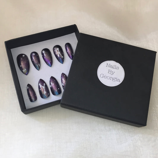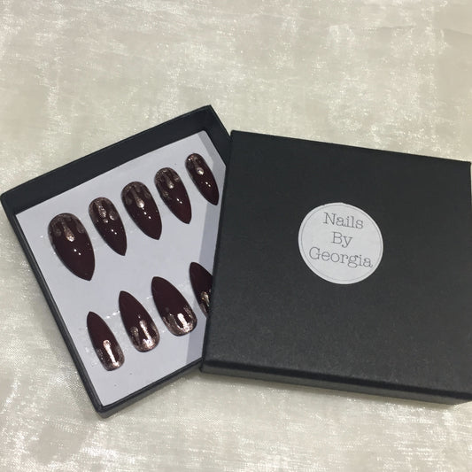 Burgundy Gloss Stilettos with Rose Gold Glitter Drip Design