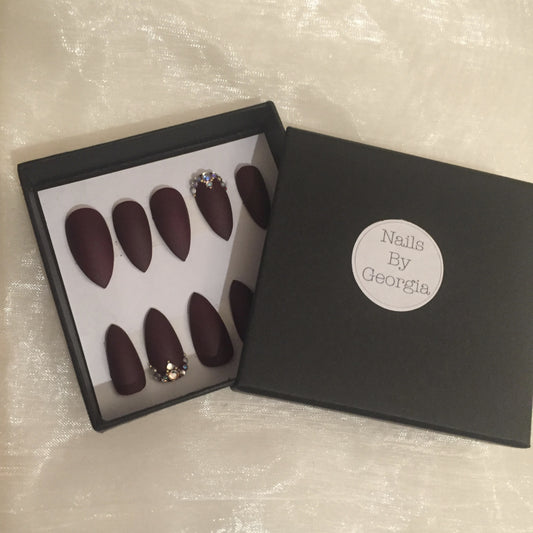 Burgundy Matte Stilettos with Gold Bead and Rhinestones